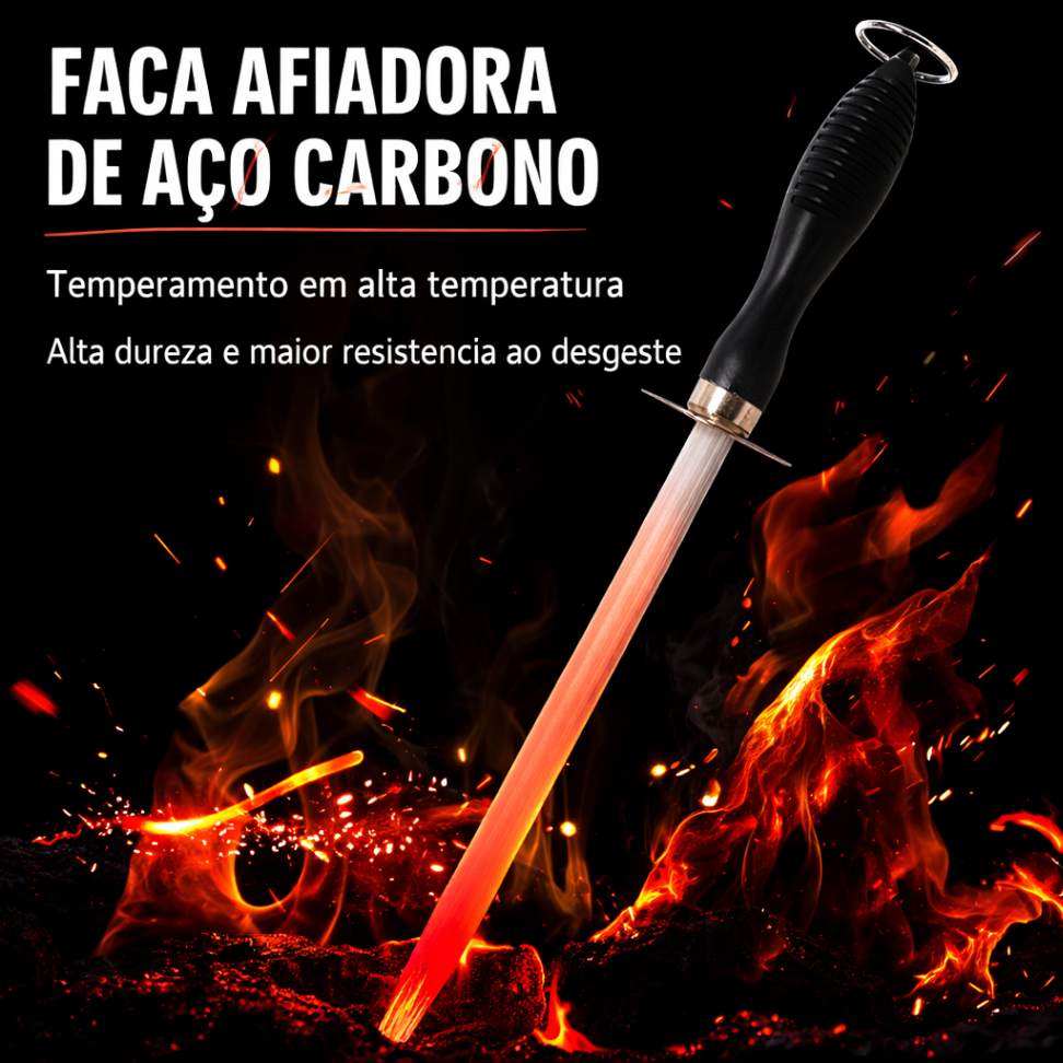 Diferente de afiadores tradicionais que retiram material da lâmina, a Chaira Imperial trabalha com mecanismo inteligente de realinhamento do fio. Com sua tecnologia inovadora, criada com haste em aço inox de alta resistência atua diretamente na borda da lâmina, corrigindo os desalinhamentos e devolvendo o corte original sem agredir o aço da sua faca.