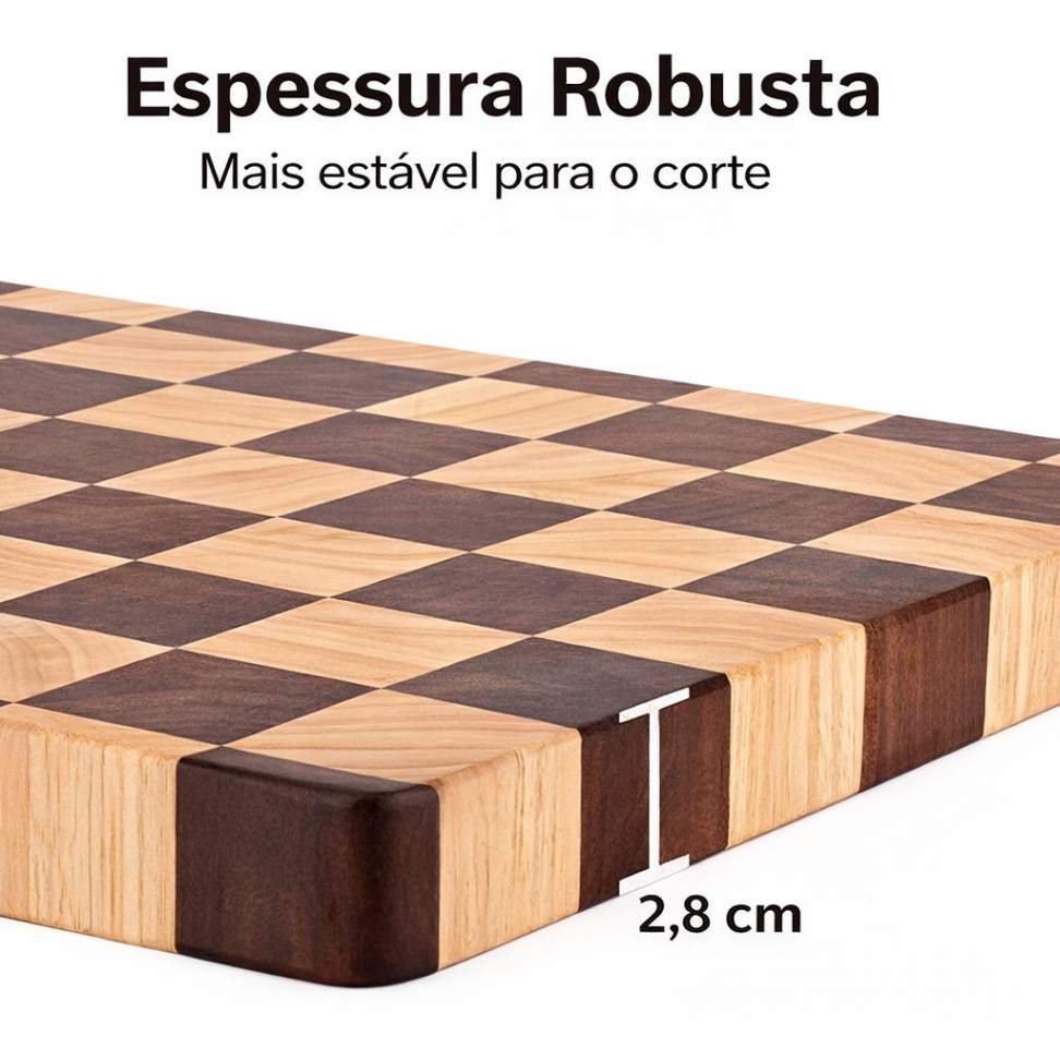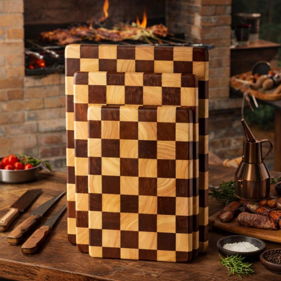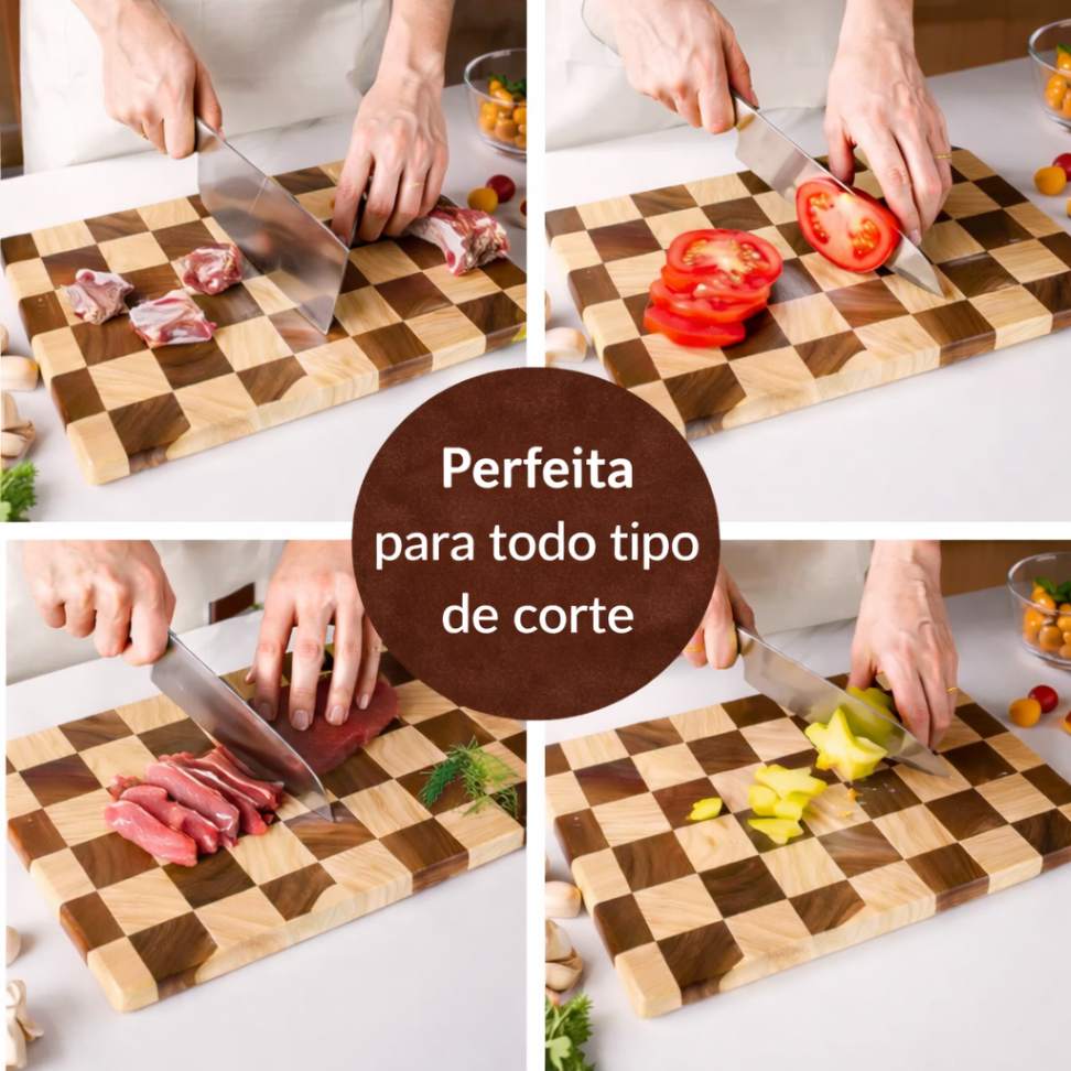 A Tábua Chef é o item que você percebe a diferença no primeiro toque, criada com madeira tratada que transmite segurança, firmeza e a certeza de que você está usando algo feito para durar. Com seu design em xadrez chama atenção, valoriza o ambiente e passa presença, é o tipo de peça que não fica guardada, fica exposta.
